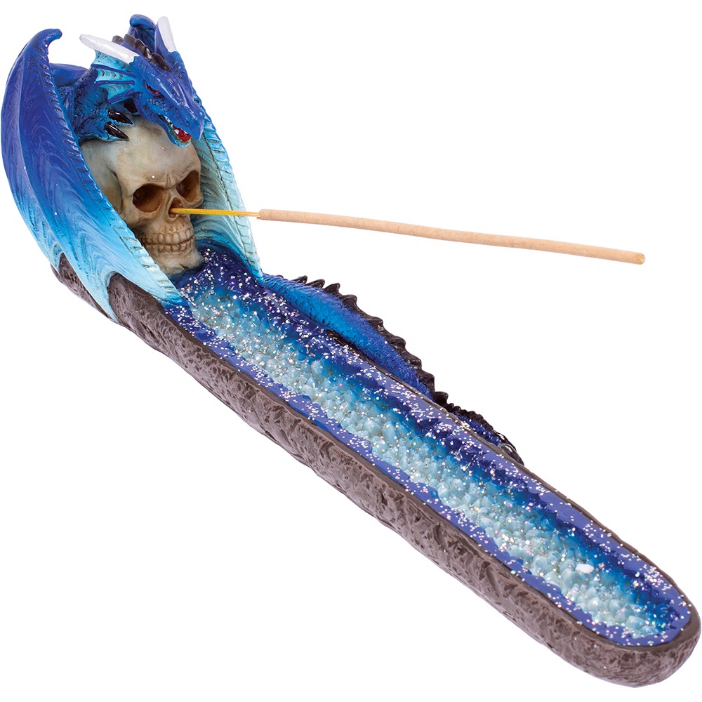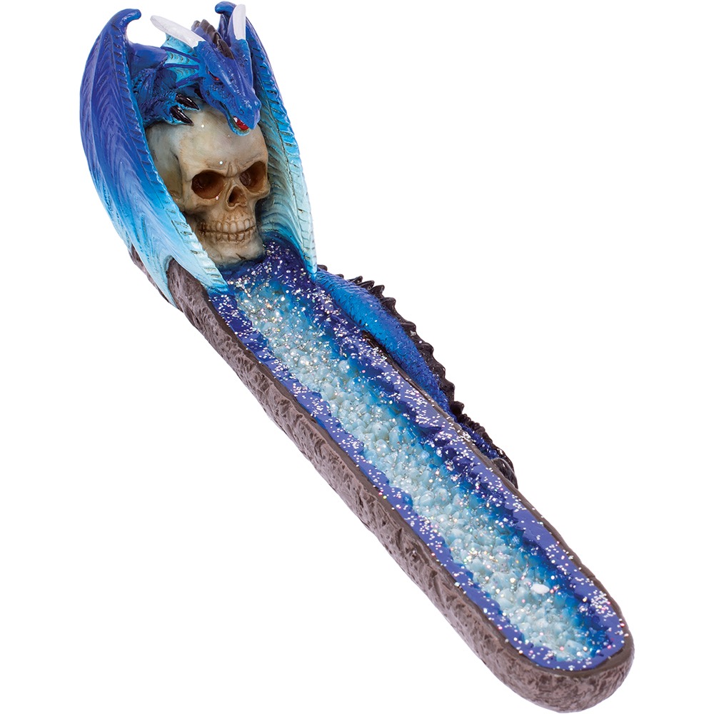 11in Blue Dragon on Skull in Crystal Flat Incense Burner (IB213)