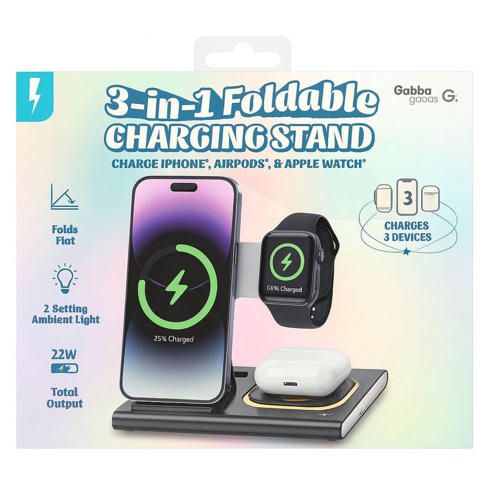3 in 1 Foldable Charging Stand – Charge IP, AIRPODS AND WATH – FOLDS FLAT – 5W FOR AIRPODS – 15W FOR SMARTPHONE – WHITE