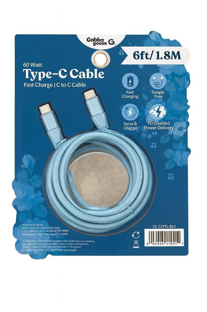 Gabba Goods 60 WATT 6FT TYPE-C FAST CHARGE C TO C CABLE – Blue