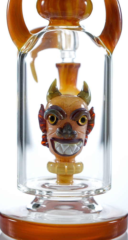 MK100 Glass Presnts their Demon rig. Made with rich US colors this water pipe will give you smooth percolation. This beautiful piece has a wide round base that will give you perfect stability. Alongside this piece you will get a matching colored funnel horwn bowl. Don’t miss out on this wonderful piece.