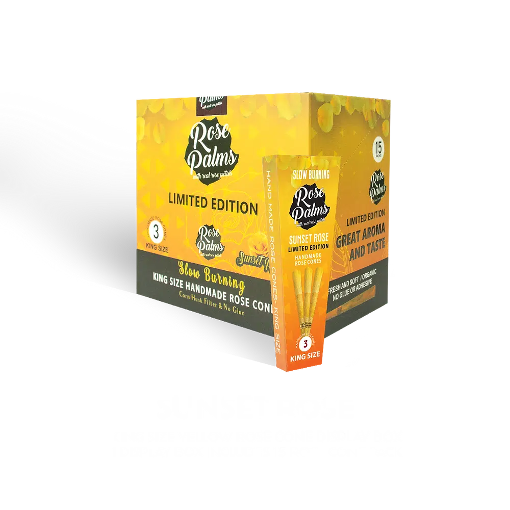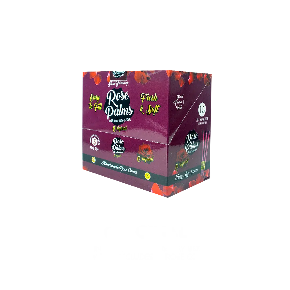 Handcrafted with real rose petals for an unrivaled sensory experience. Each petal undergoes a meticulous cleaning process using distilled water, ensuring the removal of any impurities, and then passes through stringent quality assurance inspections. The result is a luxurious wrap that promises a slow-burning indulgence like no other. Expertly crafted by our skilled artisans, our Rose Palms are made from carefully selected buds, ensuring exceptional petal quality. These cones offer a 100% organic and tobacco-free option for your smoking pleasure. Elevate your smoking ritual and embrace the essence of real roses with Rose Palms.